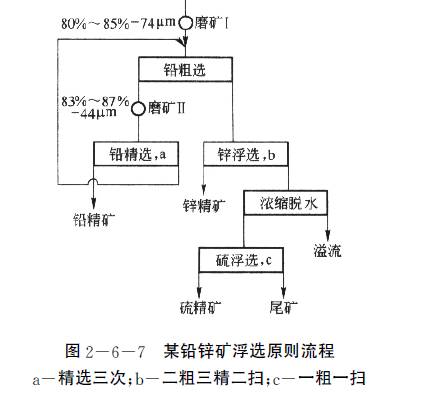 兩段連續(xù)磨礦(82%一0.074mm),粗精礦再磨(85%~90%一0.044mm.)和鉛循環(huán)高堿度的優(yōu)先浮選流程(原則流程如圖)。使鉛精礦品52%以上,回收率80%以上。